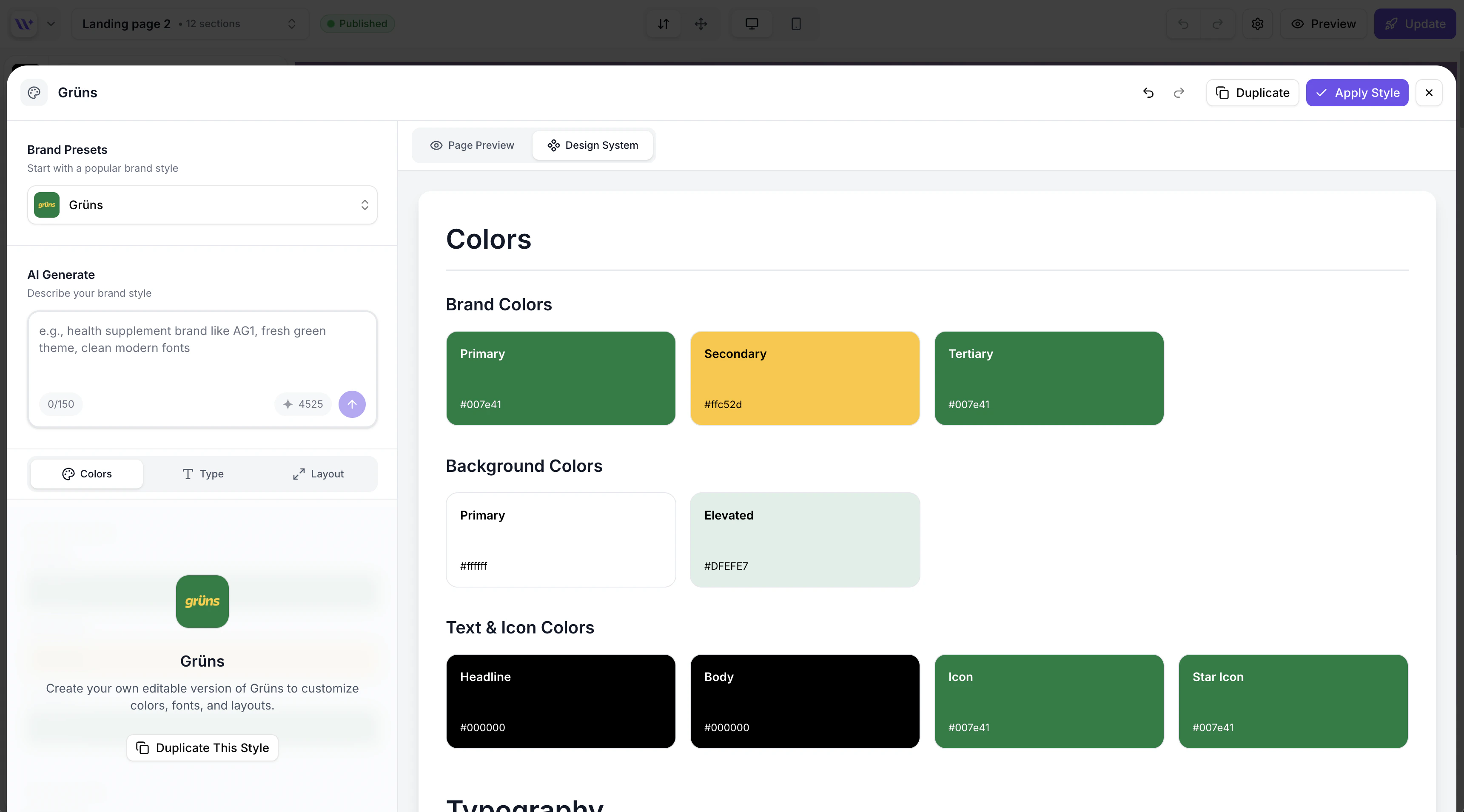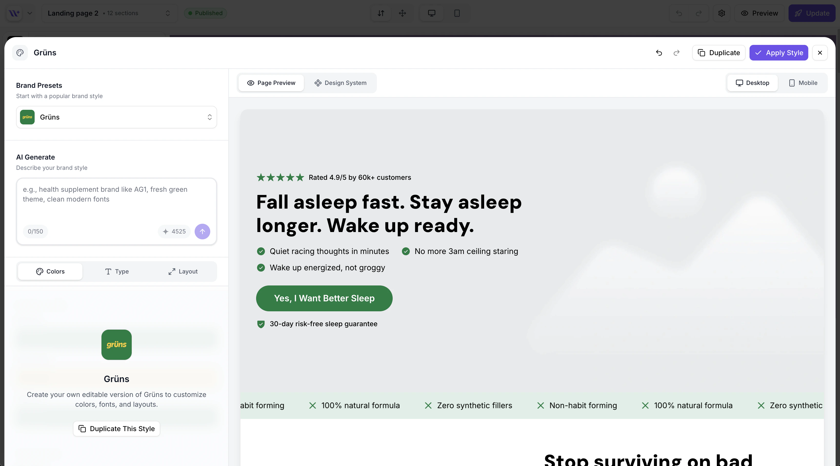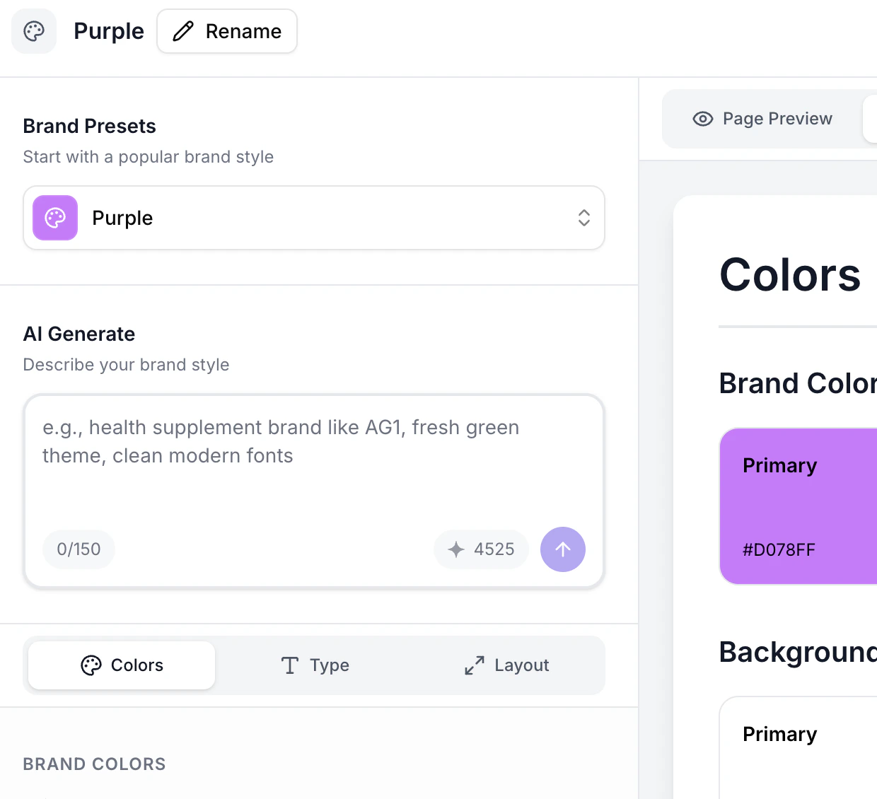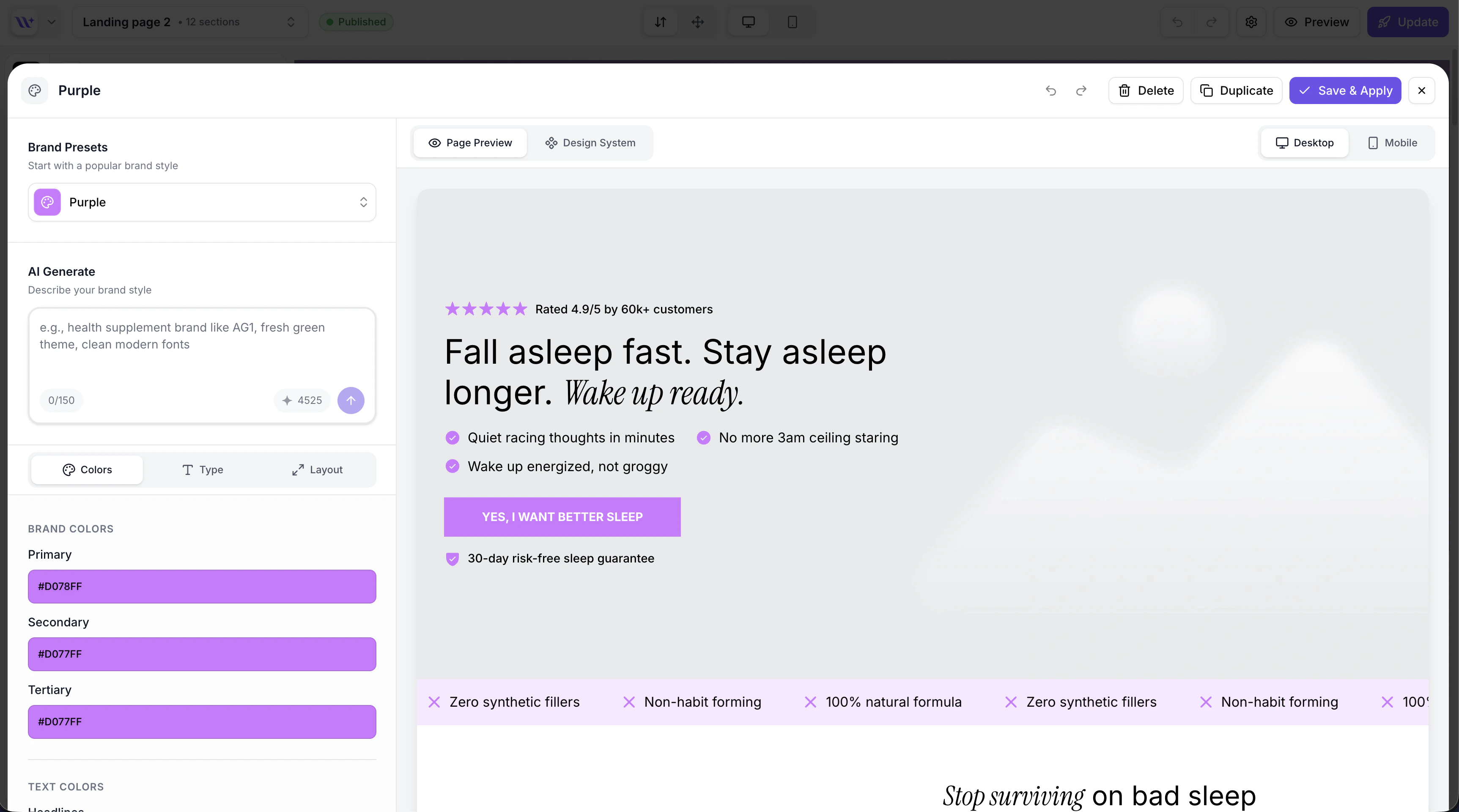 - In the builder: Change the page’s brand style from the page settings or brand style selector in the builder toolbar.