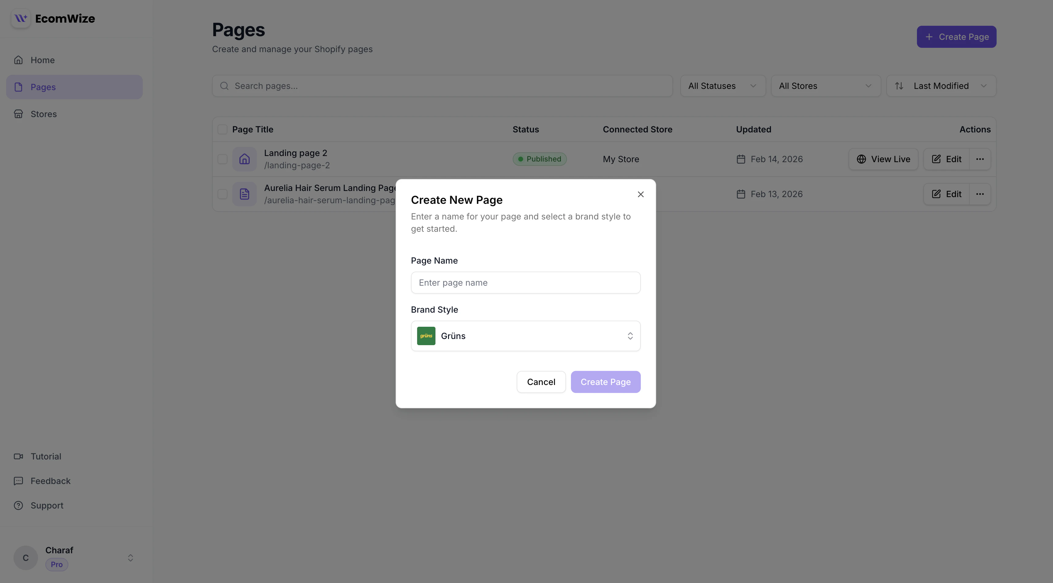 After creating a page, you can configure additional settings in the Page Settings panel:- Store connection — Link the page to a Shopify store for publishing