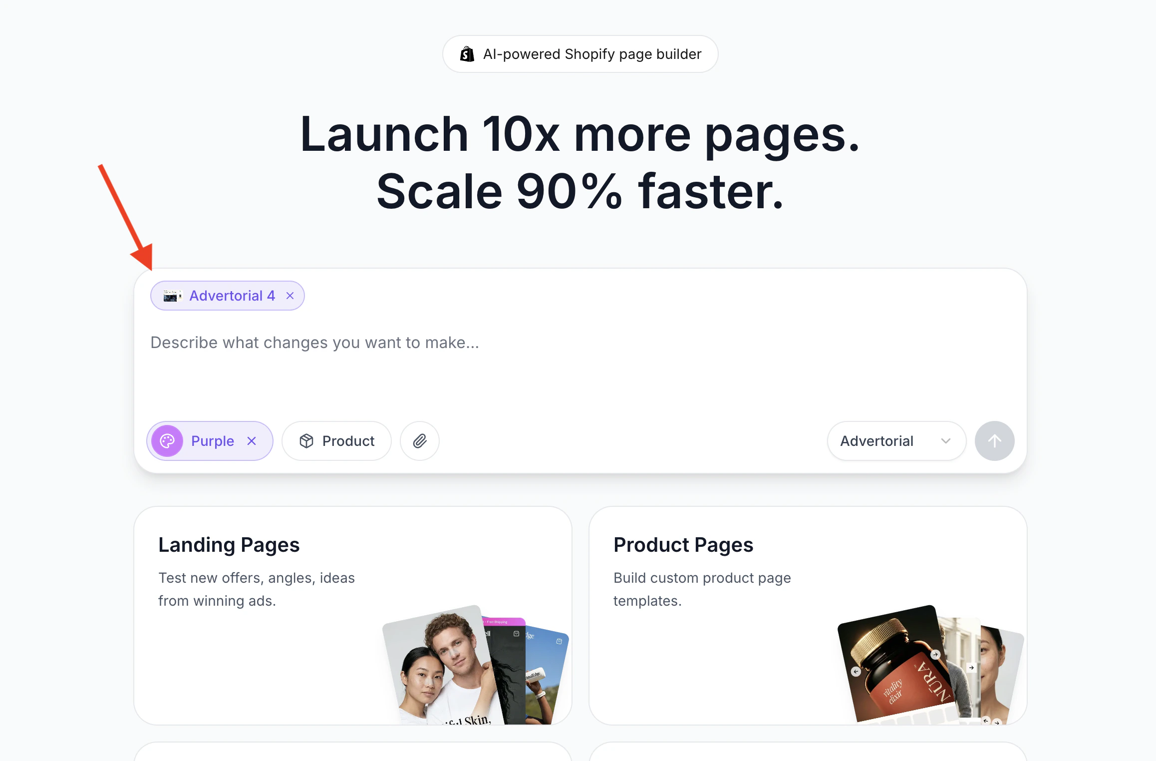 Use the dropdown next to the submit button to choose a page type: Landing Page, Product Page, Listicle, or Advertorial. Below the input, optional page type cards provide suggestions and inspiration.