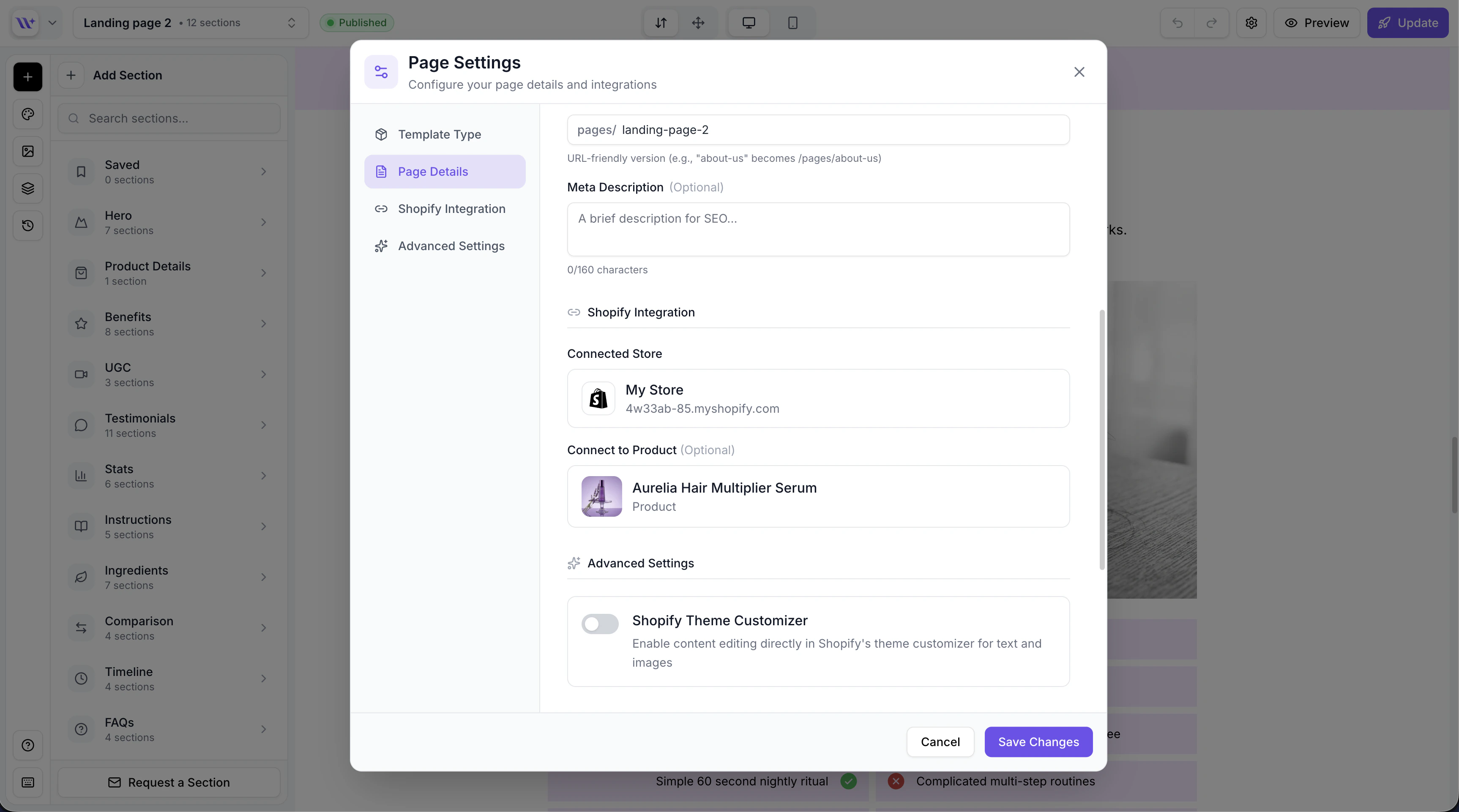 For pages that showcase a specific product, link a Shopify product:- Click the product dropdown to see products from the selected store