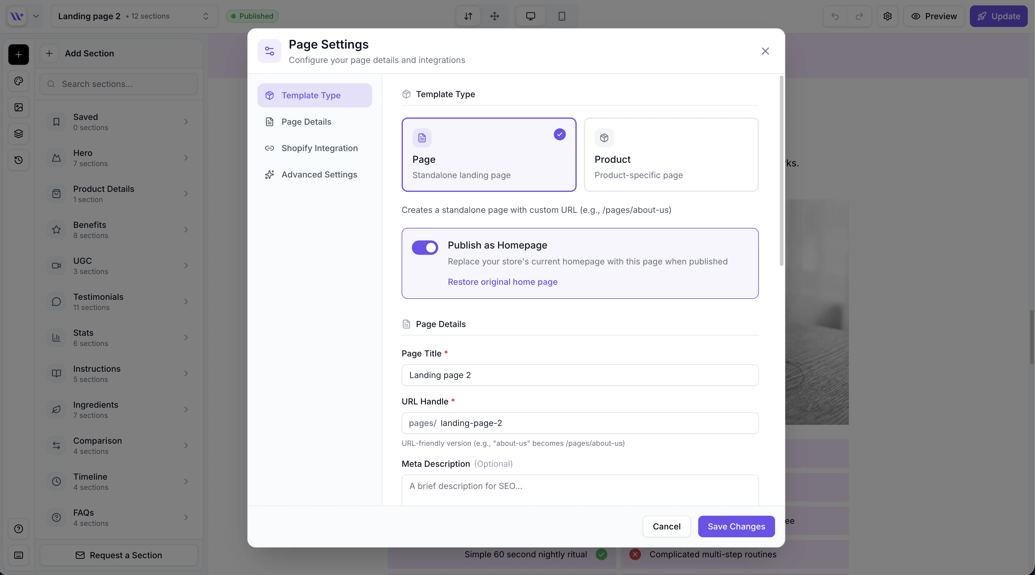 Toggle this option to publish the page as your Shopify store’s homepage instead of creating a new page. When homepage publishing is enabled and a backup exists, a Restore original homepage option becomes available, letting you revert to your store’s original homepage at any time.Shopify-Editable Toggle