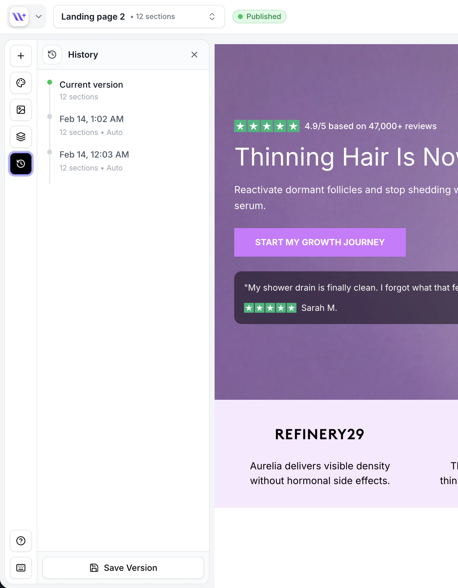 Restoring a version replaces your current page sections with the version’s sections. Your previous state before restoring is not automatically saved as a new version — save a manual version first if you want to preserve it.