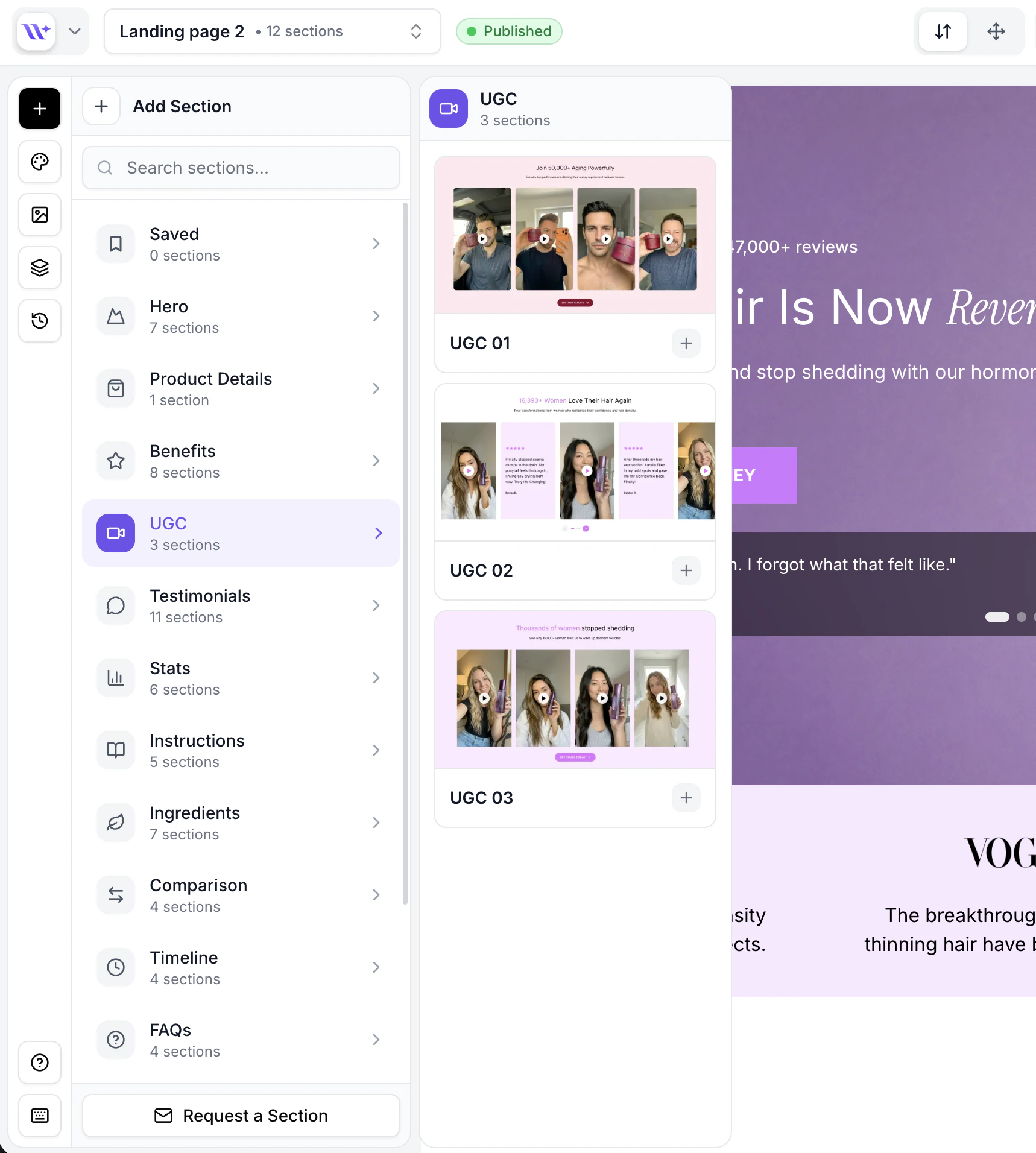If you know what type of section you want, use the search bar at the top of the sections panel:- Type a keyword into the Search sections field (e.g., “testimonial”, “hero”, “banner”).