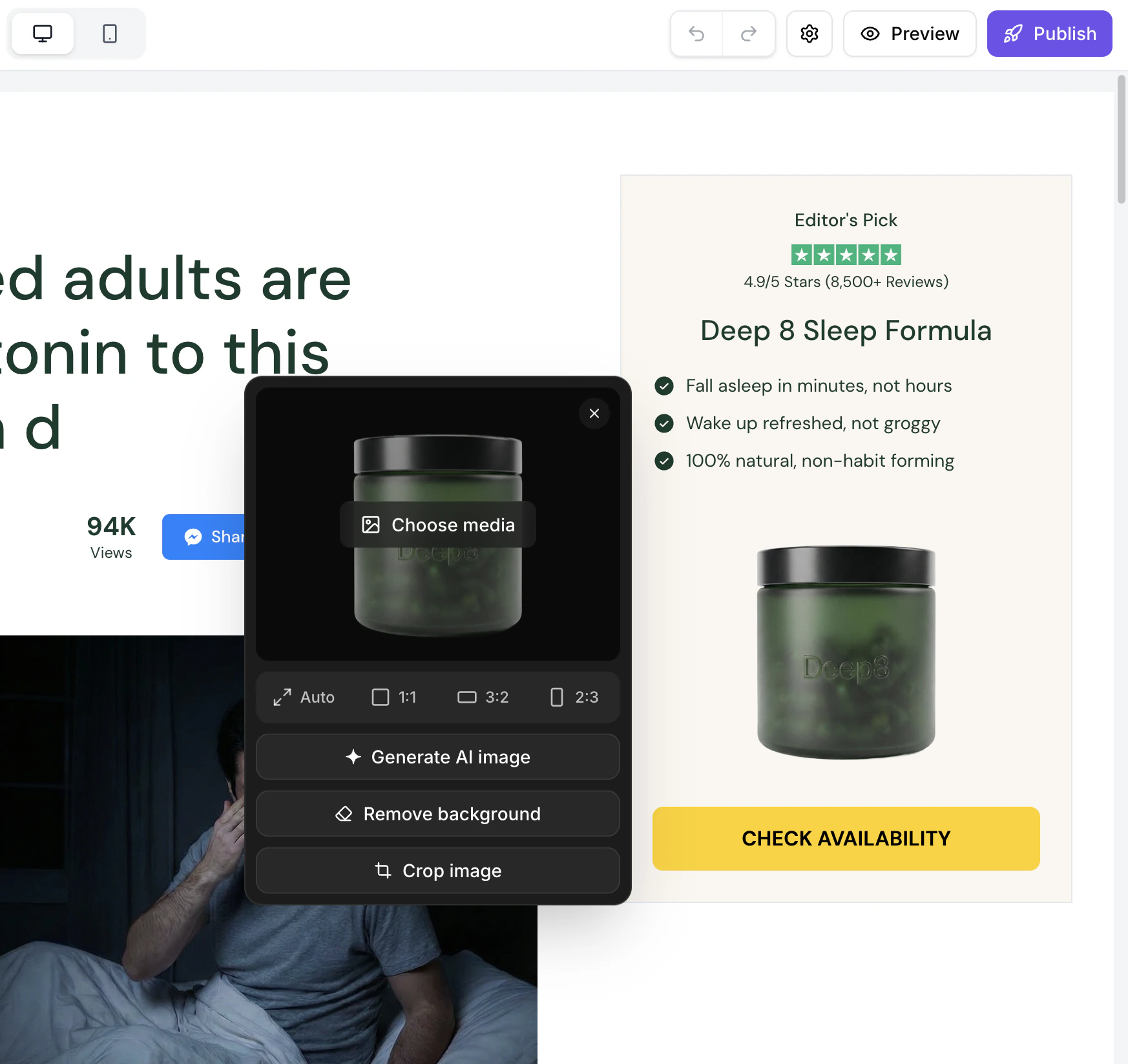 Click on any image element in a section to open the media editor. A floating panel appears next to the image with:- Media preview showing the current image or video