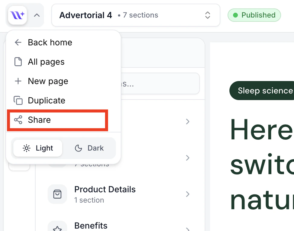 To share a page, open it in the builder and click the EcomWize logo in the top-left corner to open the main menu. Click Share to open the Share modal where you can control all sharing settings.