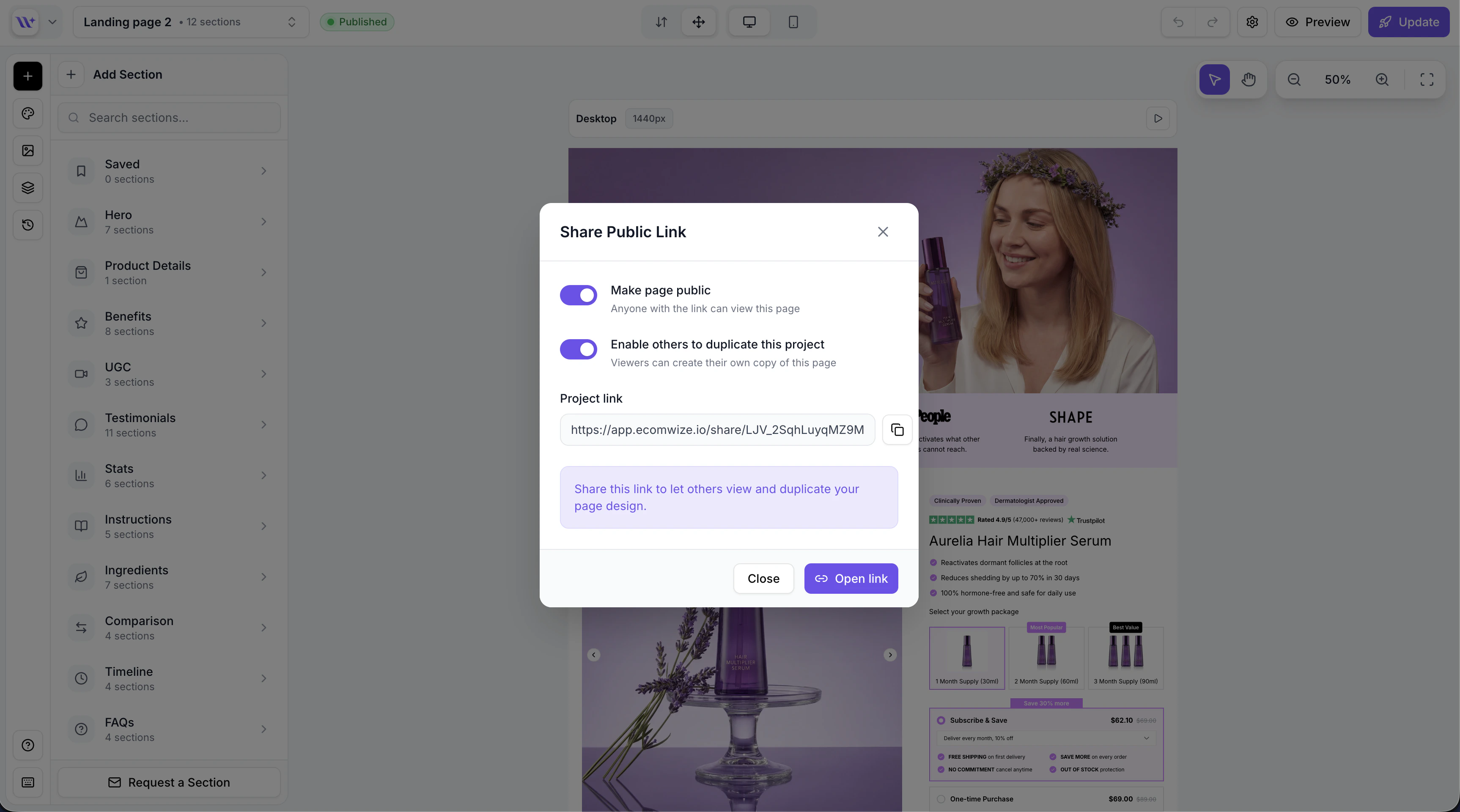 When sharing is enabled, an additional option appears: Enable others to duplicate this project. Toggling this on allows viewers to create their own copy of your page in their EcomWize account. The info banner at the bottom of the modal updates to reflect the current permission level:- View only: “Share this link to let others view your page design.”