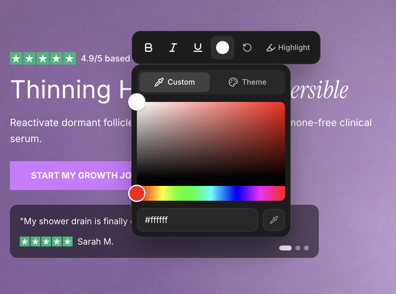 When your selected text contains formatting spans (bold, italic, color changes, etc.), a reset button (circular arrow icon) appears. Clicking it removes all inline formatting from the selection, returning the text to its default style.Text Highlight Toggle