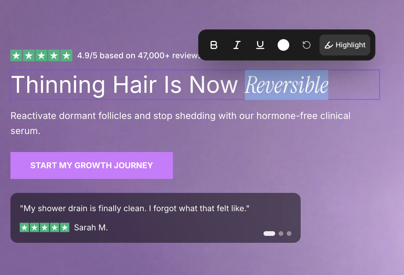 For heading text (H1-H6), if text highlighting is enabled in your brand style, a Highlight toggle appears. Activating it wraps the selected text in the highlight font configured in your brand style.