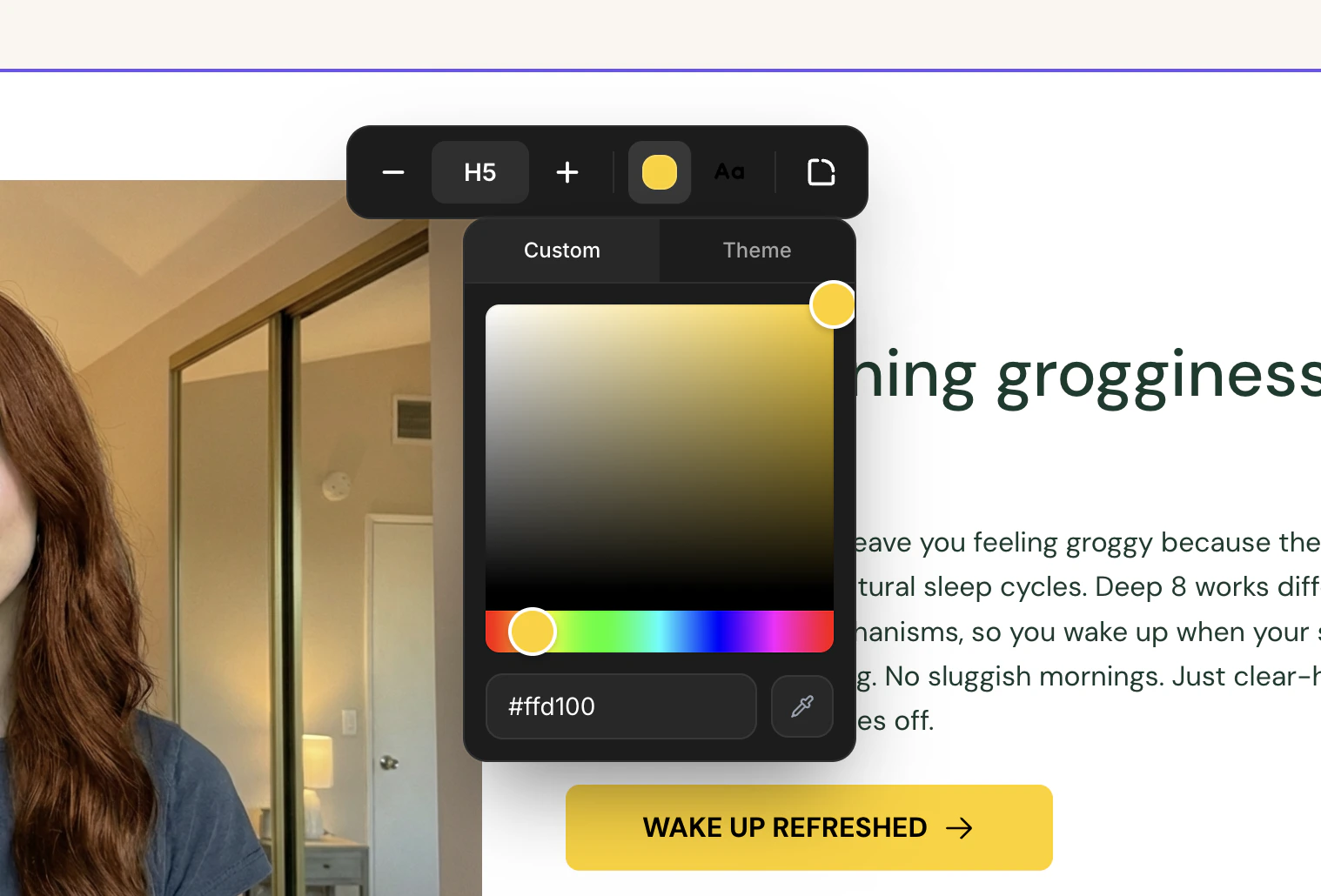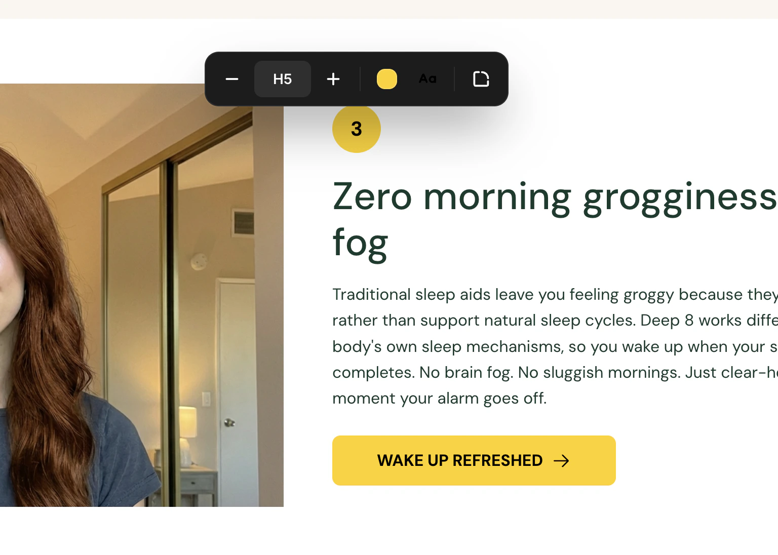 Click on any tag element in the canvas. The toolbar appears above the tag, centered horizontally. It slides in with a smooth animation.The toolbar closes when you click outside of it. All changes are applied instantly as you make them.